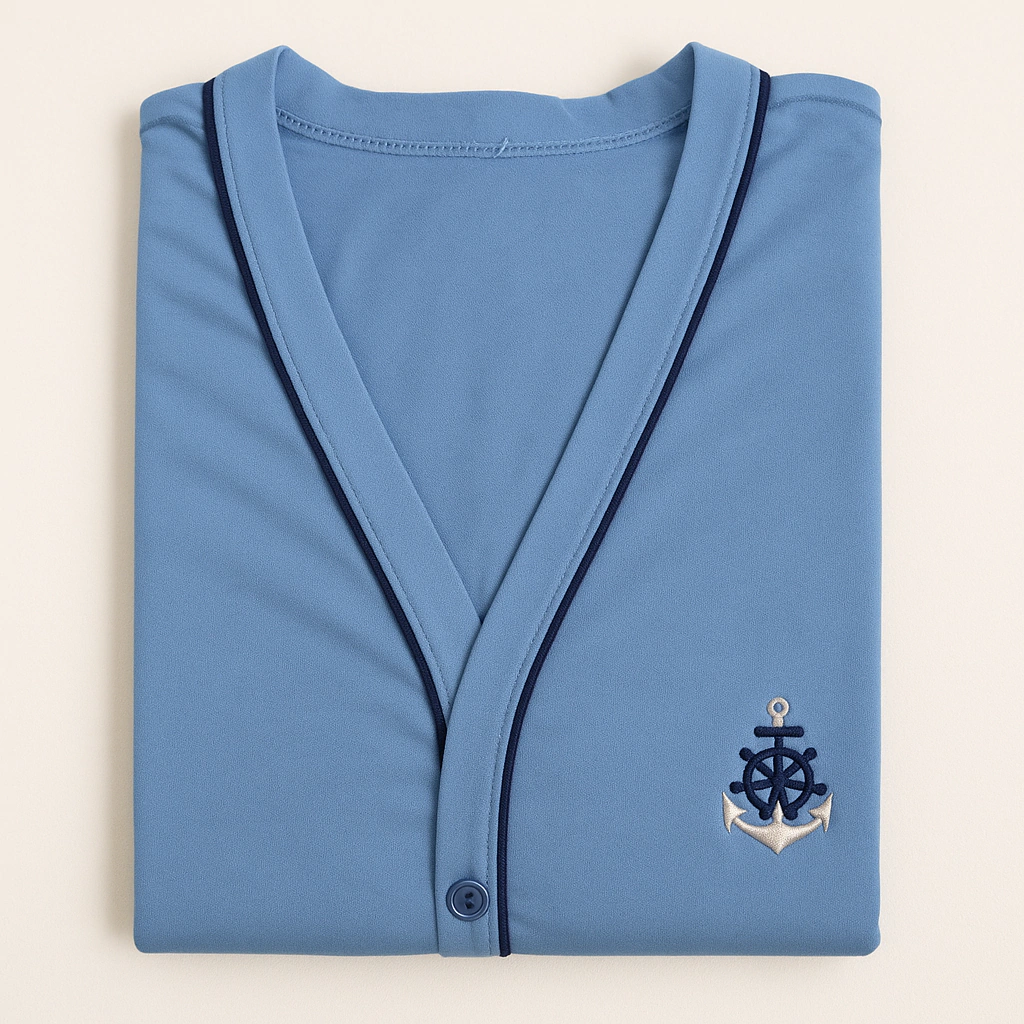 Pijama de inverno gola V, botões e aplicação de bordado.